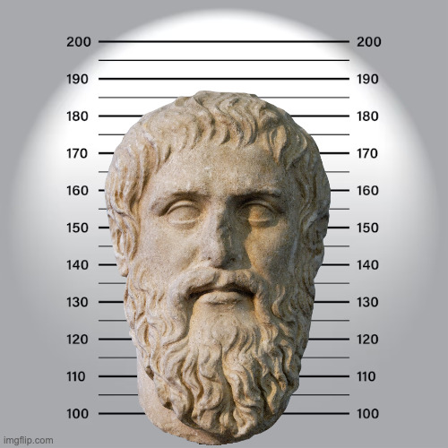 Public-domain image of Plato bust, edited by author at imgflip.com